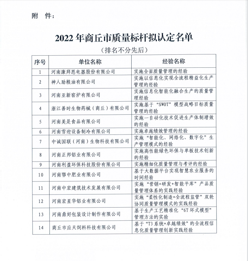 【概要描述】商丘市工(gōng)業(yè)和(hé)信息化局關于認定2022年商丘市質量标杆的(de)通知